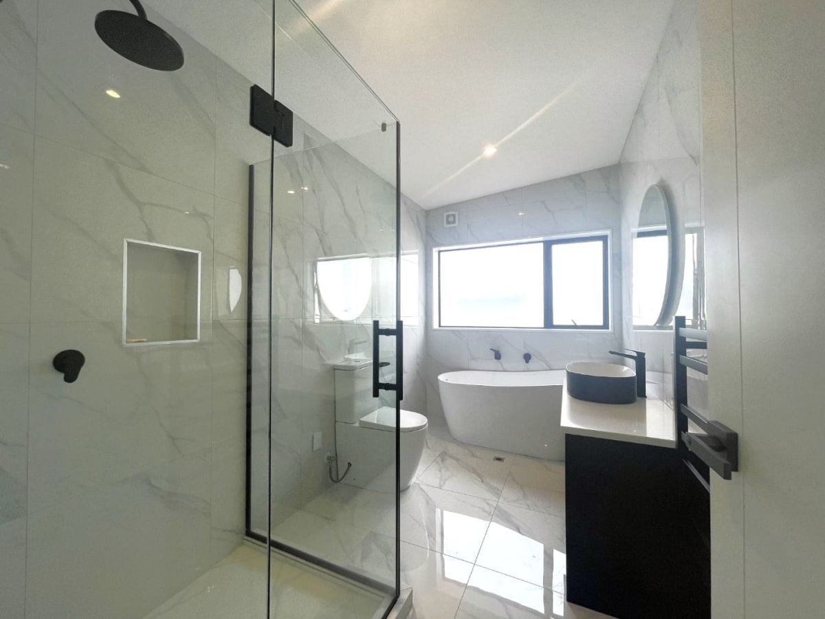 From the lounge, step out onto the good-sized balcony, where you can enjoy excellent sea views towards Rangitoto Island. This level also includes a separate laundry room and a separate guest toilet for added convenience. The property features four spacious double bedrooms, all fully carpeted and fitted with roller blinds and built-in wardrobes. The master bedroom and Bedroom 4 each have their own ensuite bathrooms, providing additional comfort and privacy. The main bathroom includes a bathtub, separate shower, heated towel rail, large mirror, and toilet.